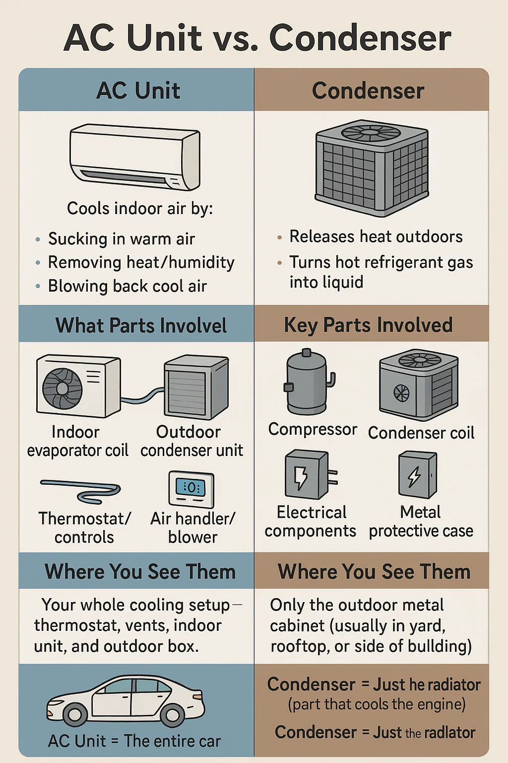 Bộ AC: Đề cập đến toàn bộ hệ thống làm mát ngôi nhà hoặc tòa nhà của bạn. Nó bao gồm tất cả các bộ phận làm việc cùng nhau.